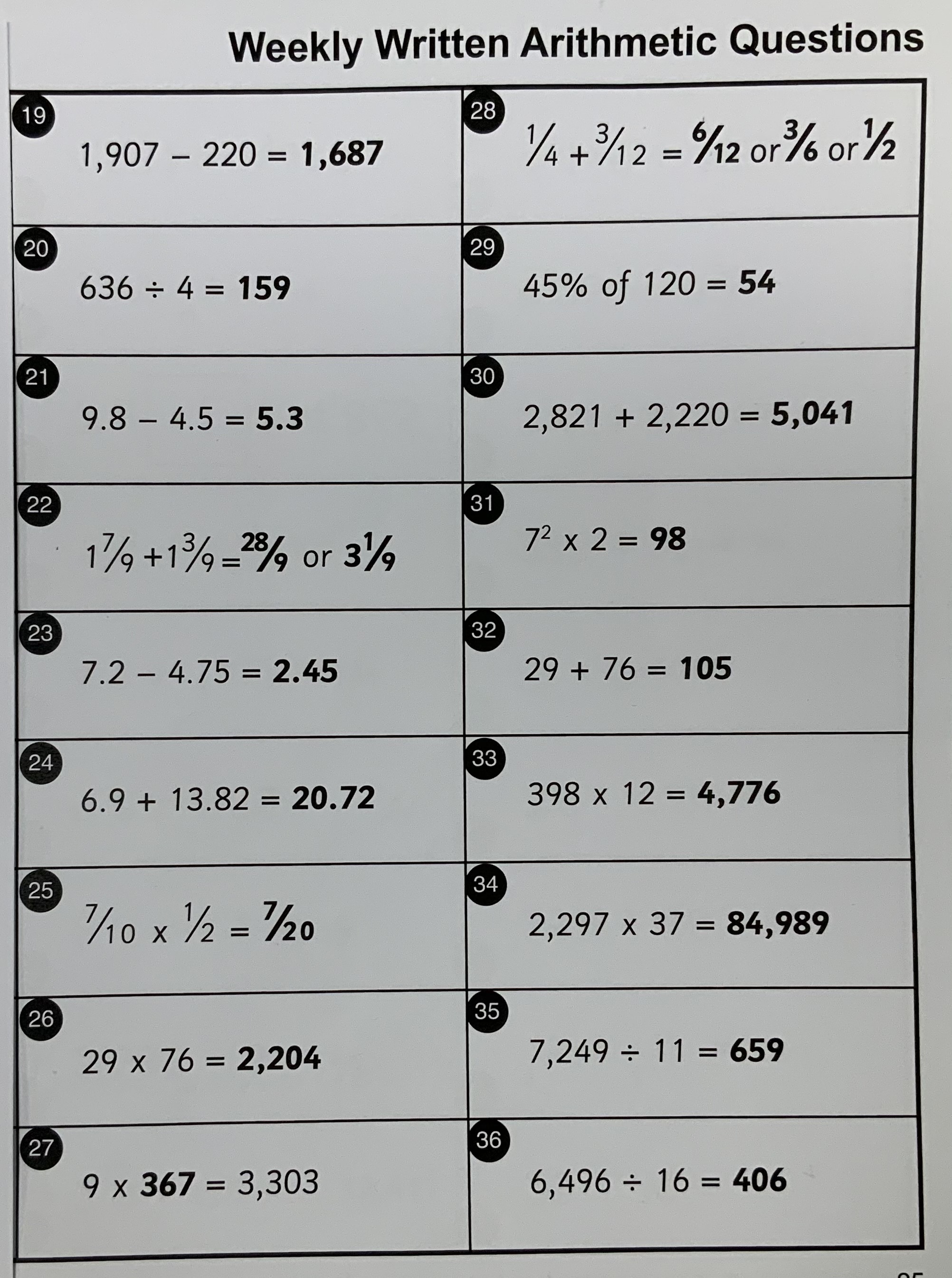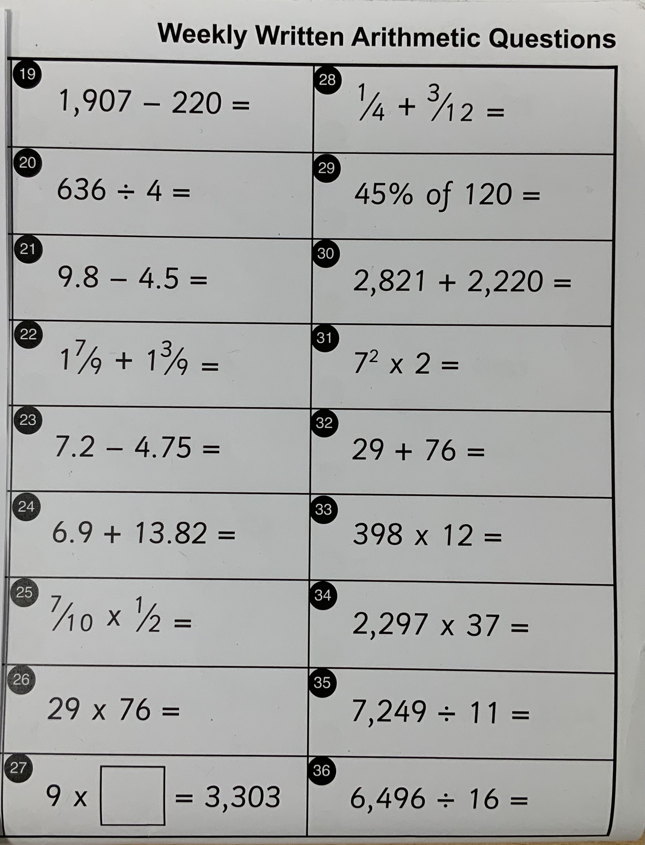 - Arithmetic quiz (19 - 36 questions). Attached at the bottom is a picture of the sheet (so you can print it or simply write the answers – with workings out – in your HOME LEARNING BOOK). I have also attached the answers (for after the quiz so no peeking!)