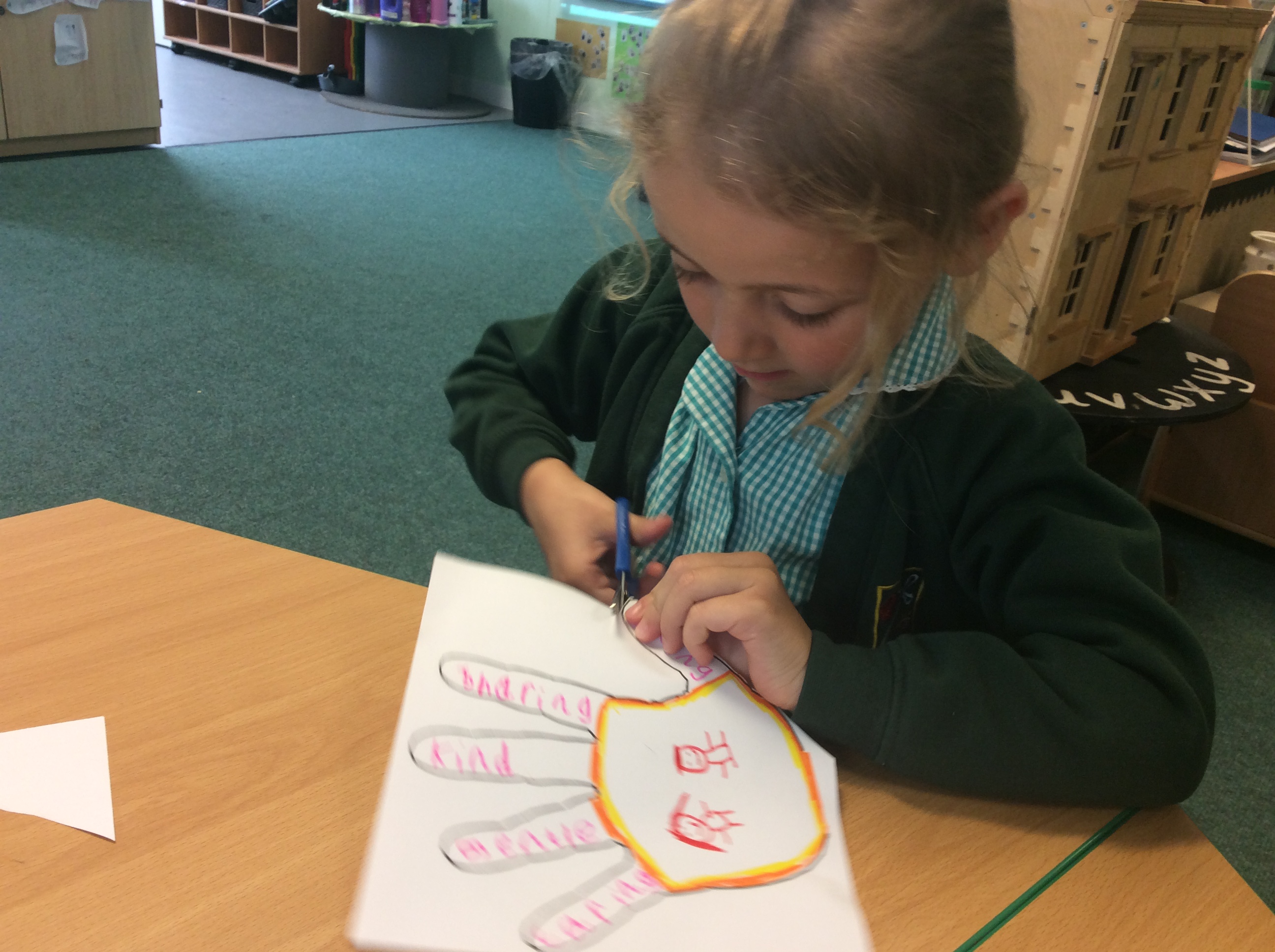 In R.E .we had a quiet reflection to celebrate the end of our topic of Holidays and Holy Days. We used our fire-coloured streamers to represent the coming of the Holy Spirit.
