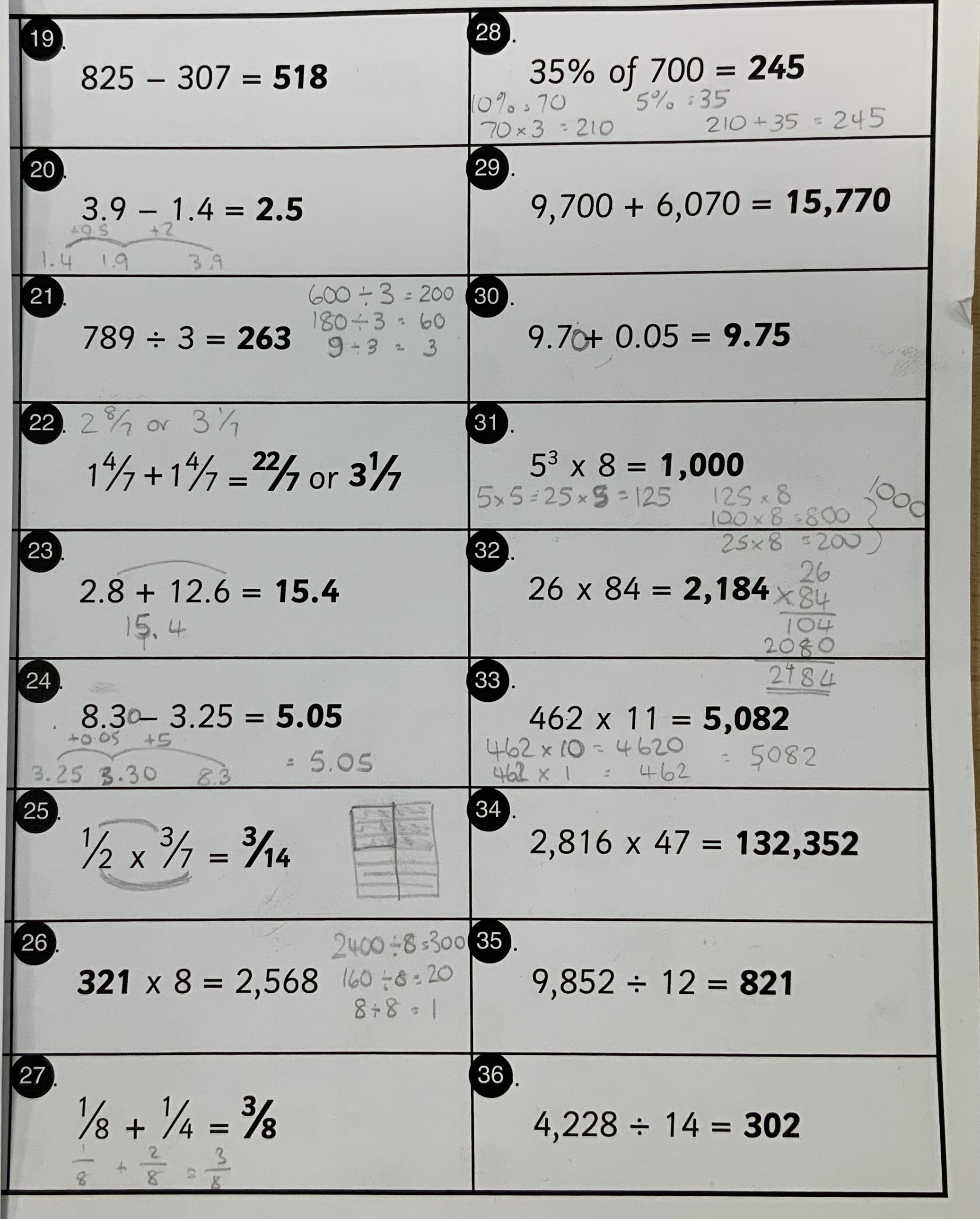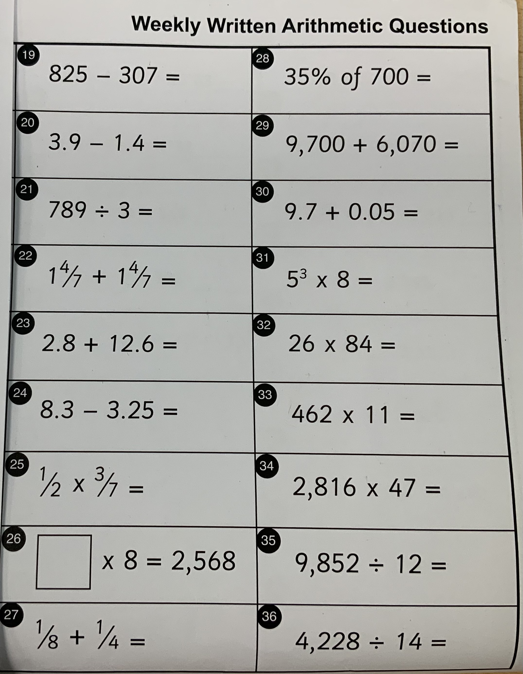 - Arithmetic quiz (19 - 36 questions). Attached at the bottom is a picture of the sheet (so you can print it or simply write the answers – with workings out – in your YELLOW BOOK). I have also attached the answers (for after the quiz so no peeking!). Try to time yourself 20 minutes for this.