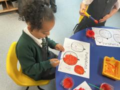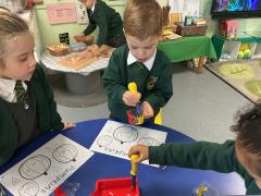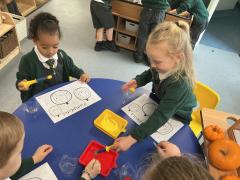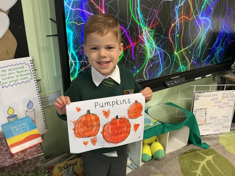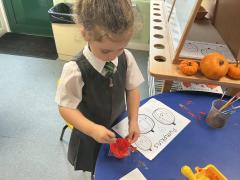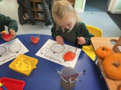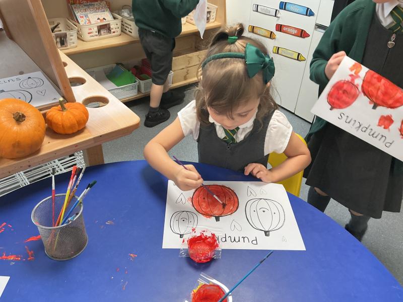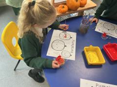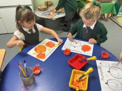 We have been mixing our own orange paint, using what we remembered from the Primary colours song last week! Then we have painted pumpkins!