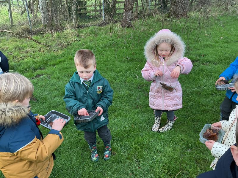 We listened to some poems about winter and discussed some of the words. Then we went to see what we could see-we saw lots of naked trees! We also saw some branches which we think might have come off the trees during the storms. We saw mole holes and stopped for a few minutes just to listen. We heard a woodpecker.
