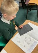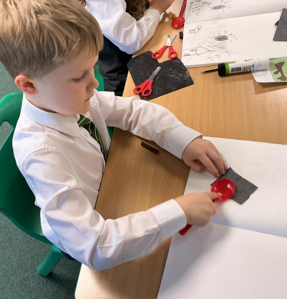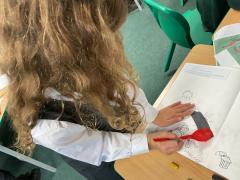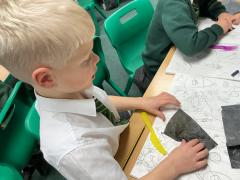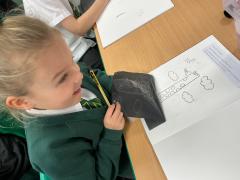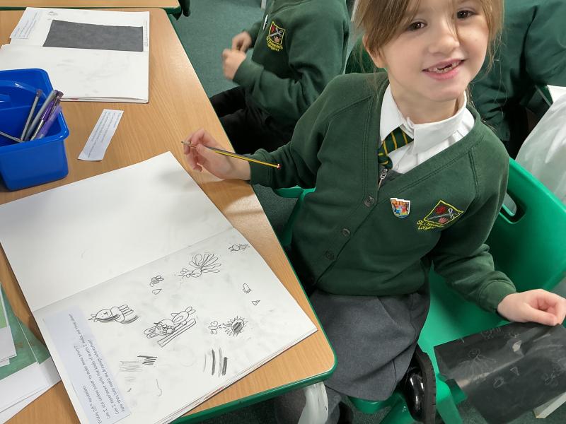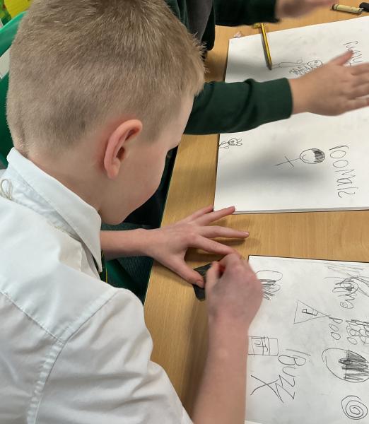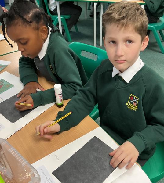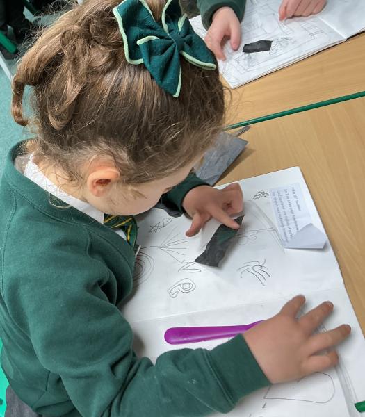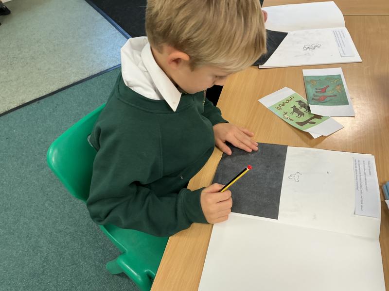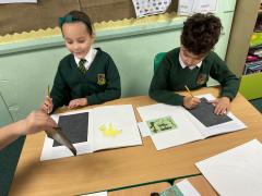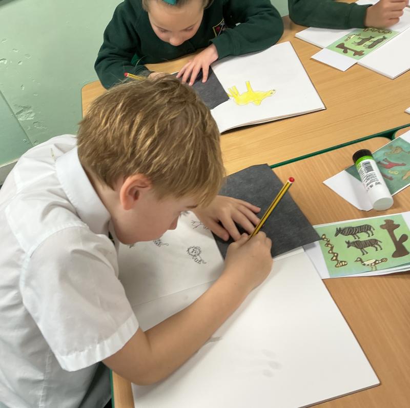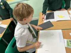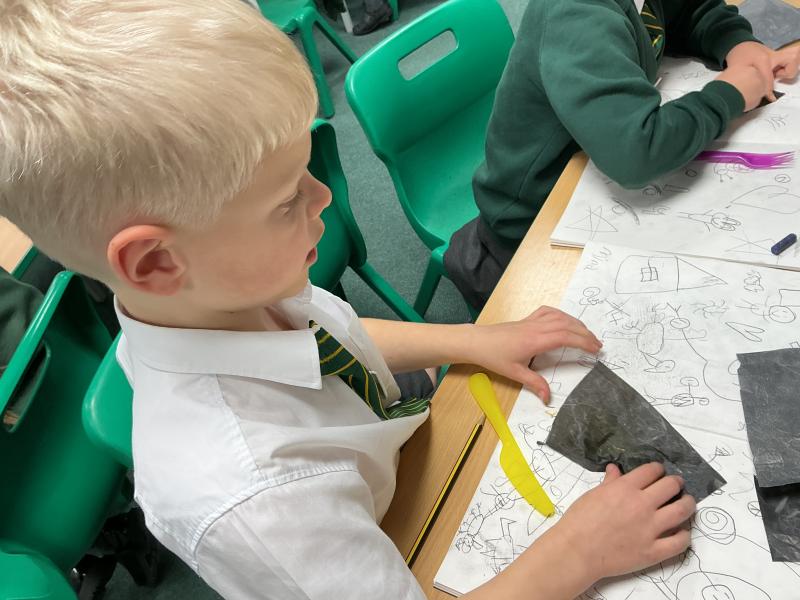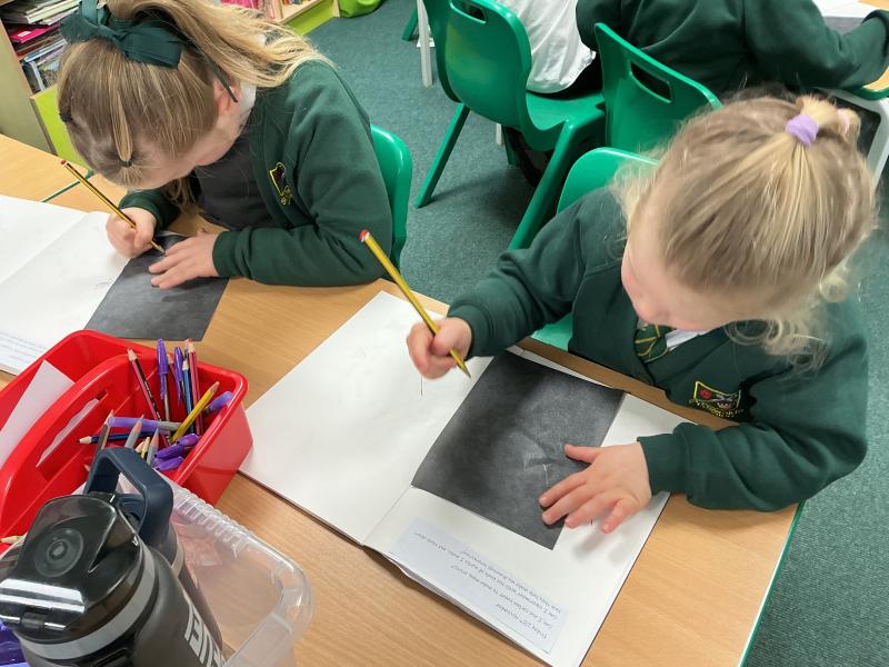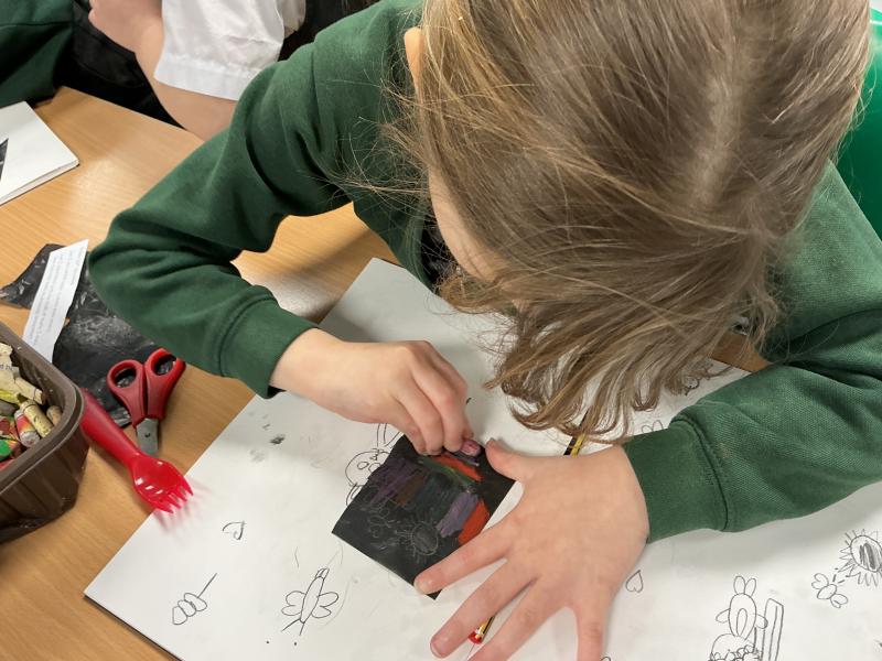We used carbon paper to make prints. We were thrilled with how well this worked. We also used oil pastels to introduce some colour into the print.