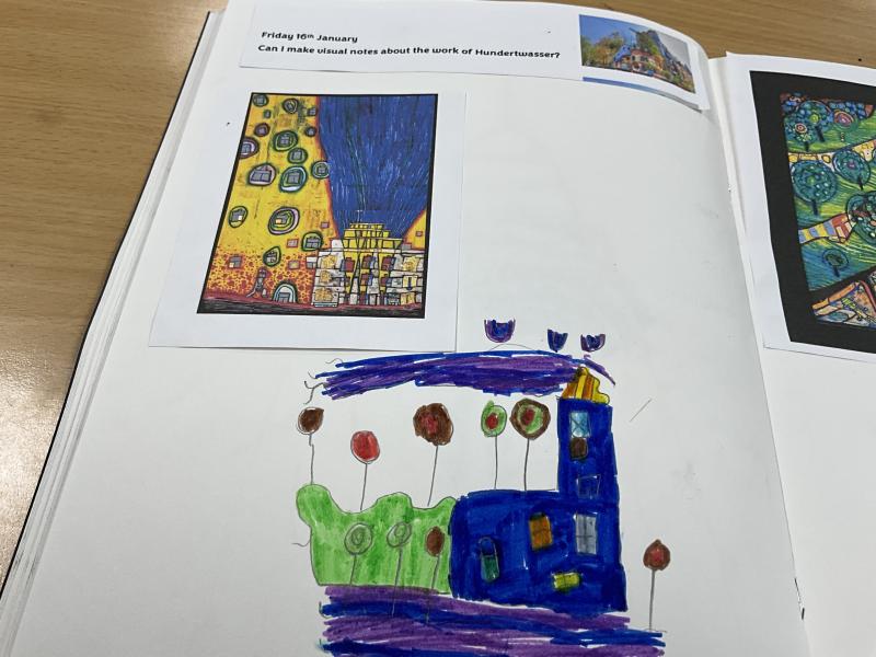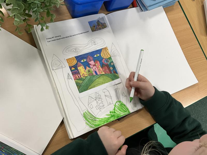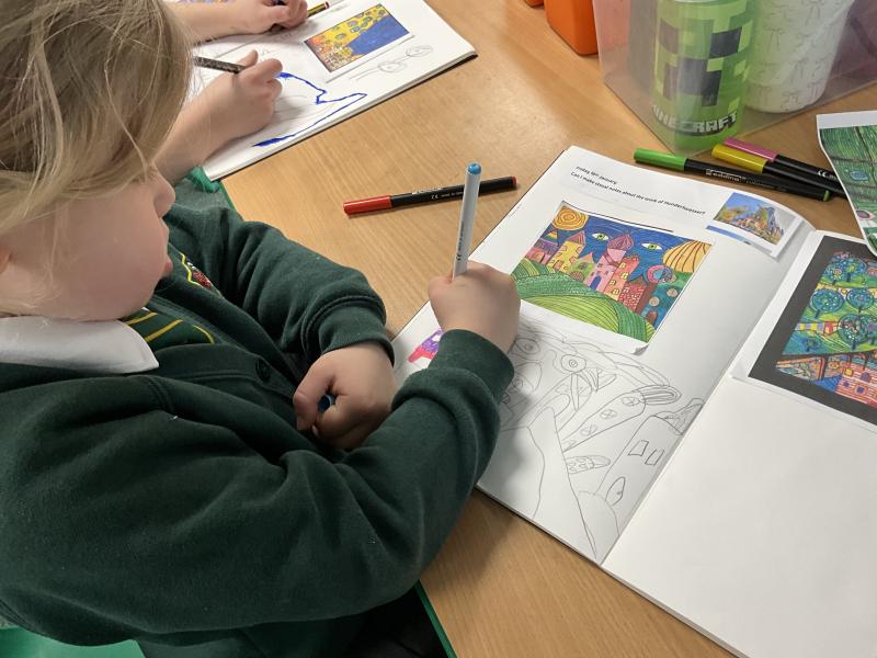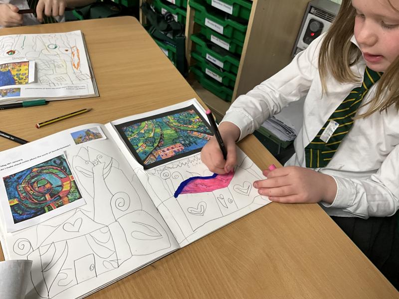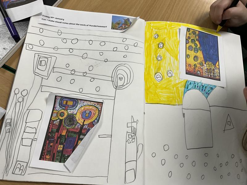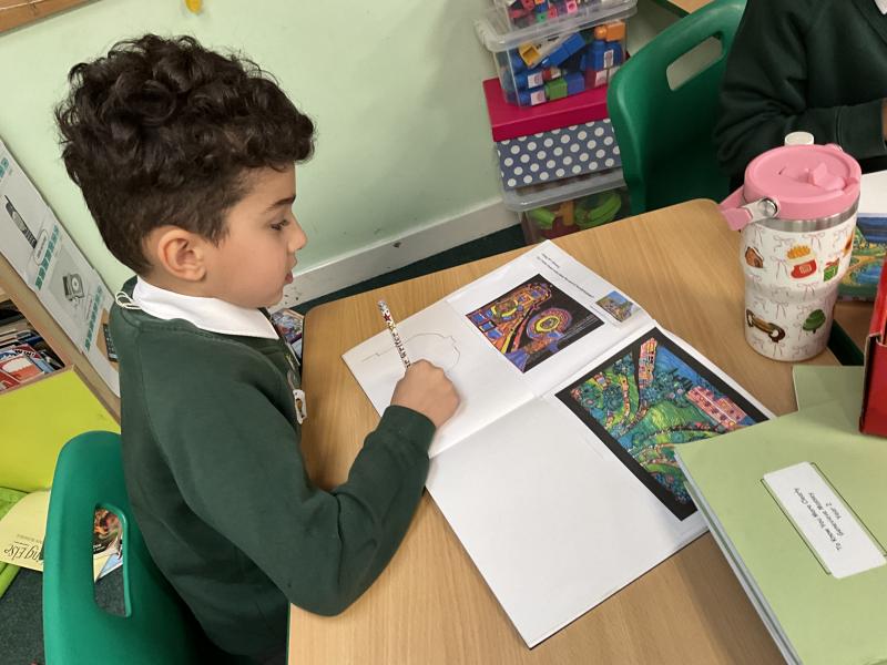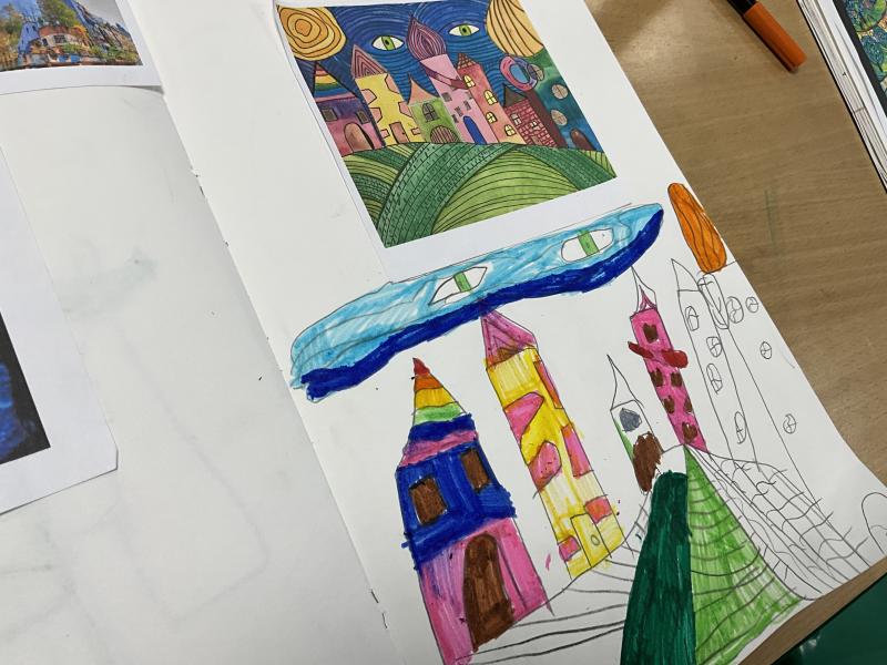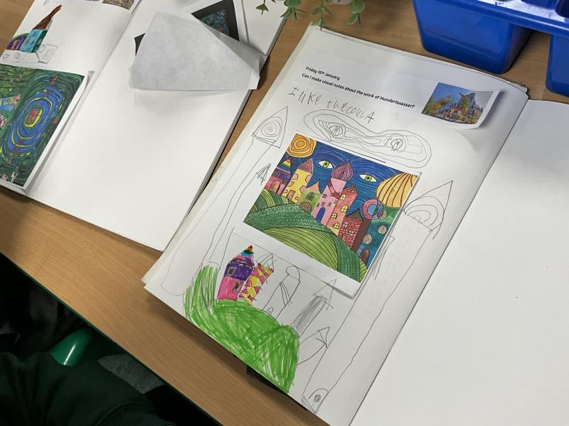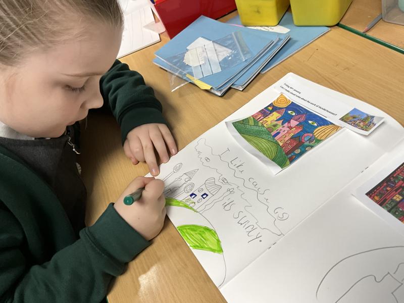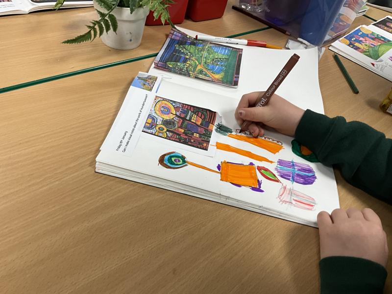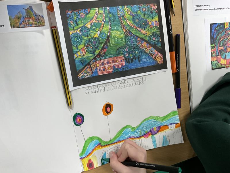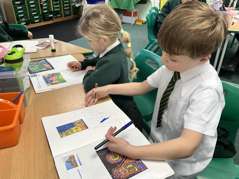 This week, Year 2 explored the colourful and imaginative artwork of Friedensreich Hundertwasser. The children studied his use of bold colours, spirals, patterns and curving lines, noticing how he avoided straight lines and symmetry. They created visual notes in their sketchbooks, experimenting with spirals, buildings and repeated patterns to understand his distinctive style. Using these ideas, the children then produced their own Hundertwasser-inspired artwork, combining vibrant colours with imaginative designs. Everyone showed creativity, confidence and focus, and they were proud to share and talk about their finished pieces.