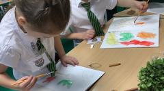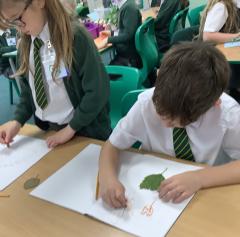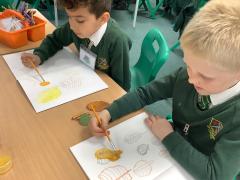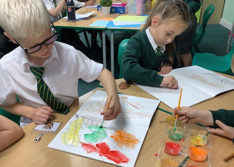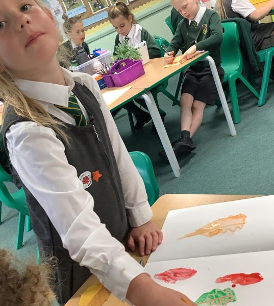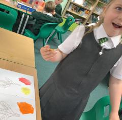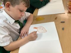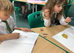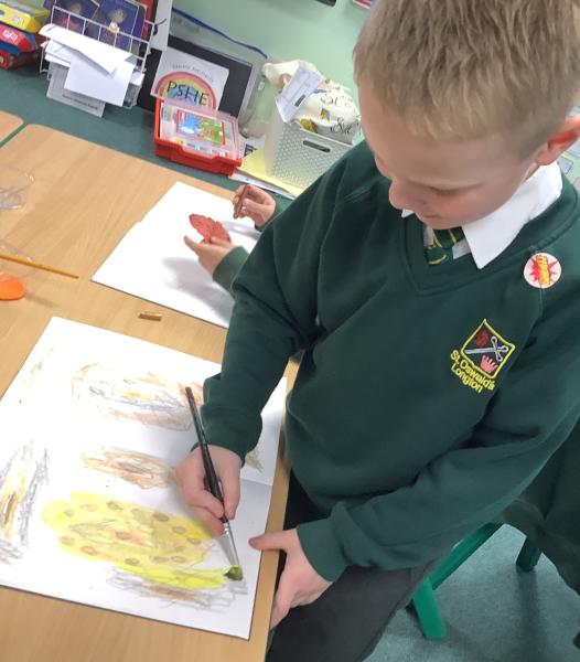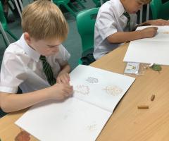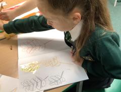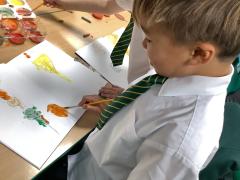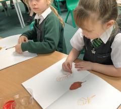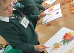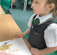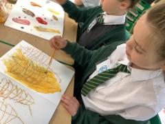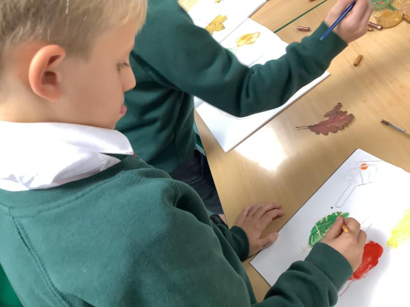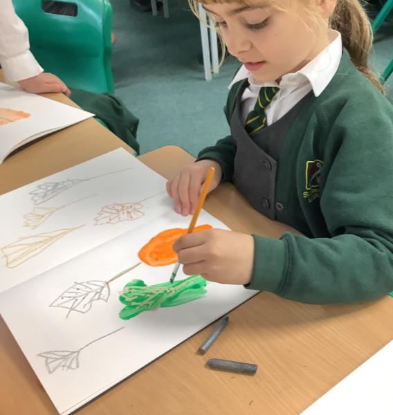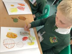 We used metallic wax crayons again to draw leaves but we then developed this by painting over our drawings. We saw some really beautiful effects.