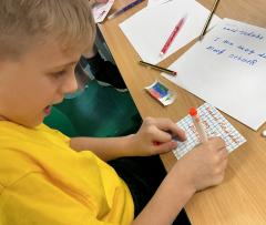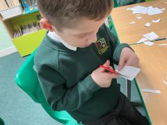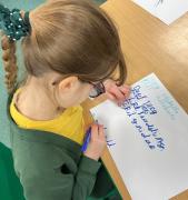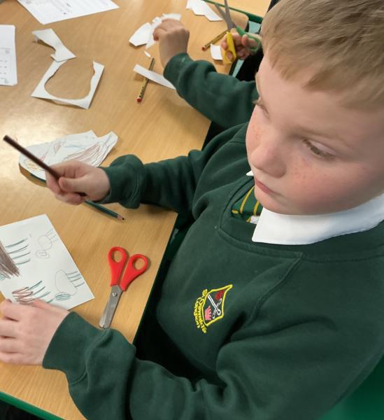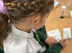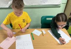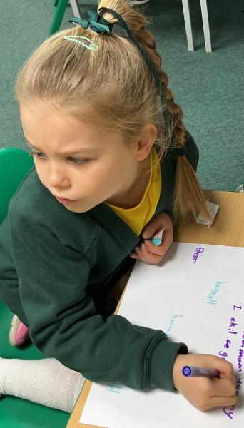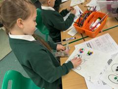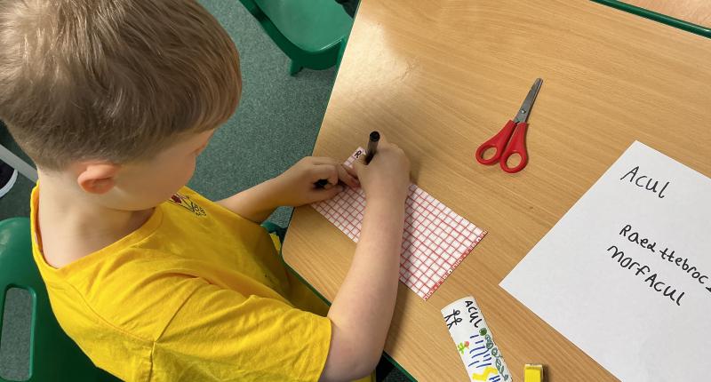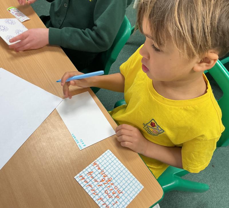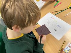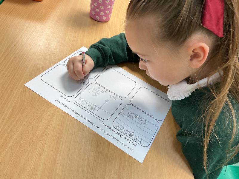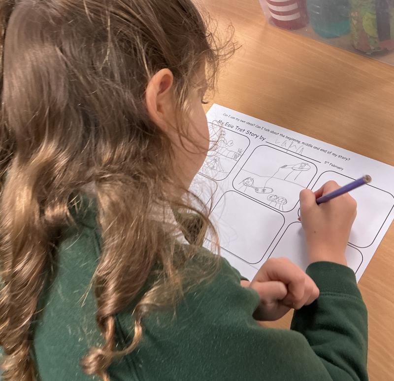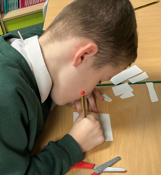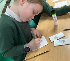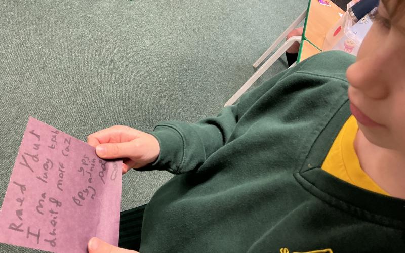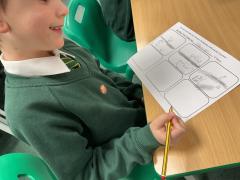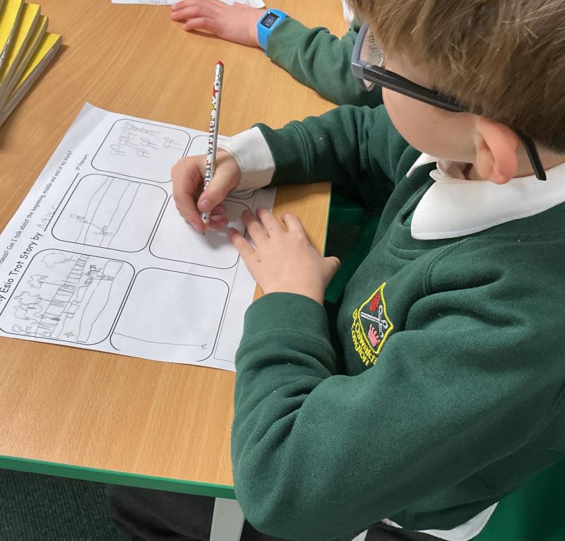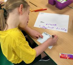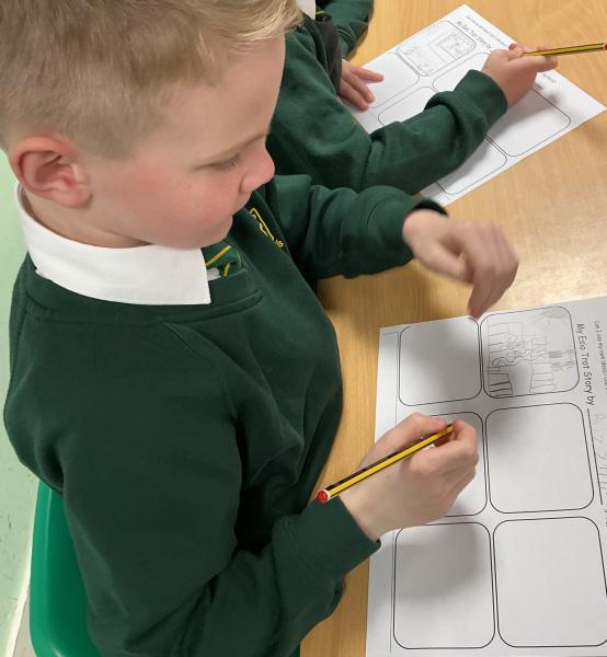 We wrote some facts about tortoises. We made some puppets of the characters and used them to act out the story. We learnt how to write in tortoise language , we wrote our name and messages in our new language. We planned our own Esio Trot story and we are going to write books next week.